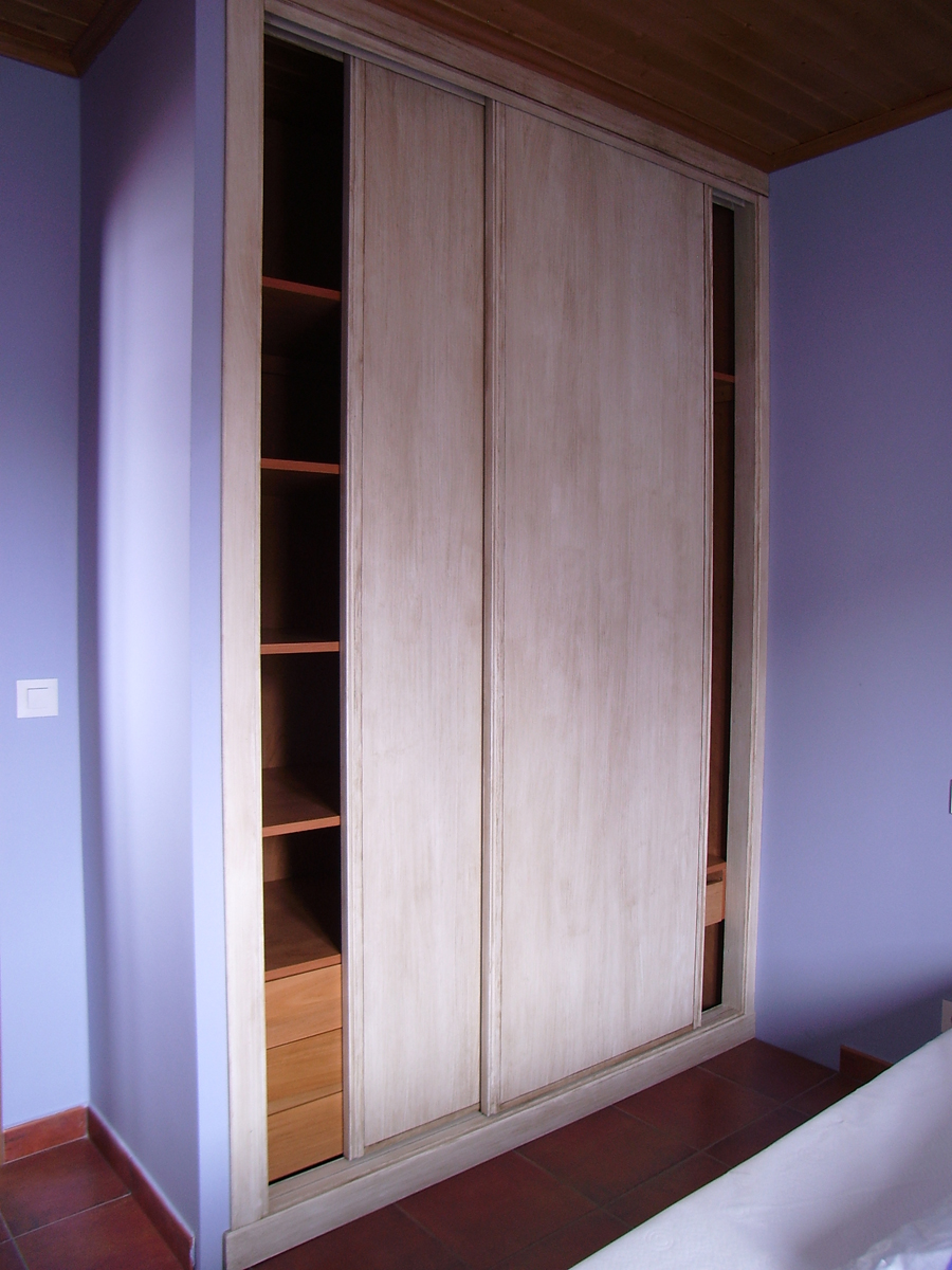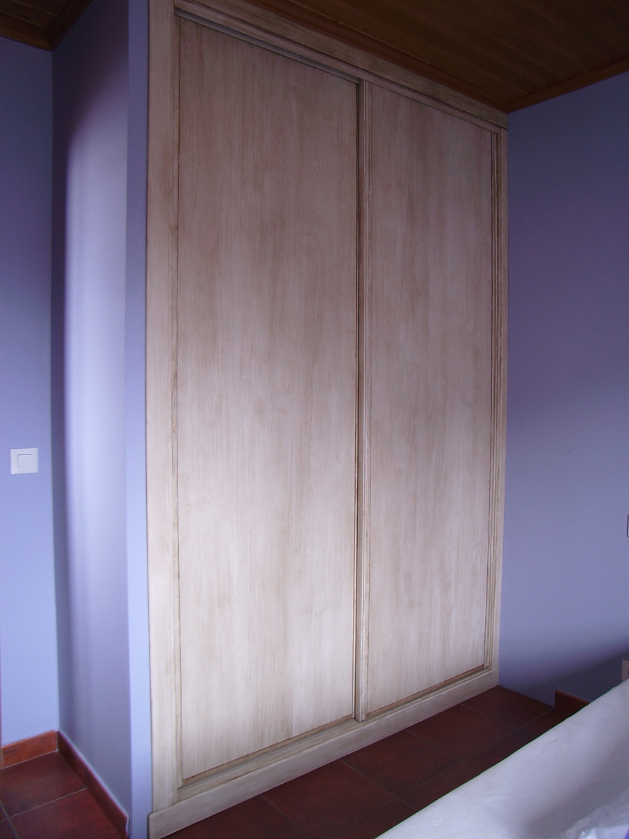 Armario con frente de puertas correderas en blanco con patina para envejecer.