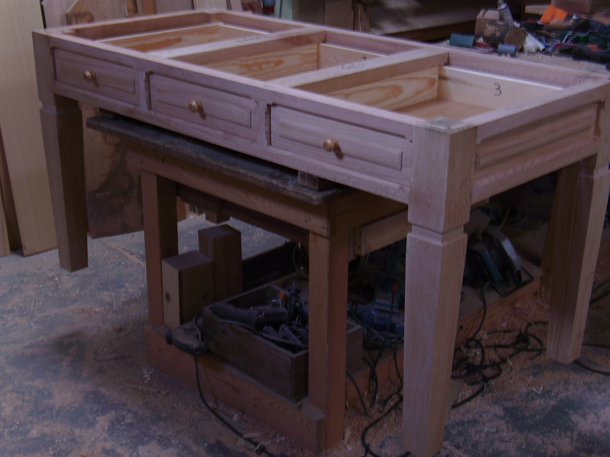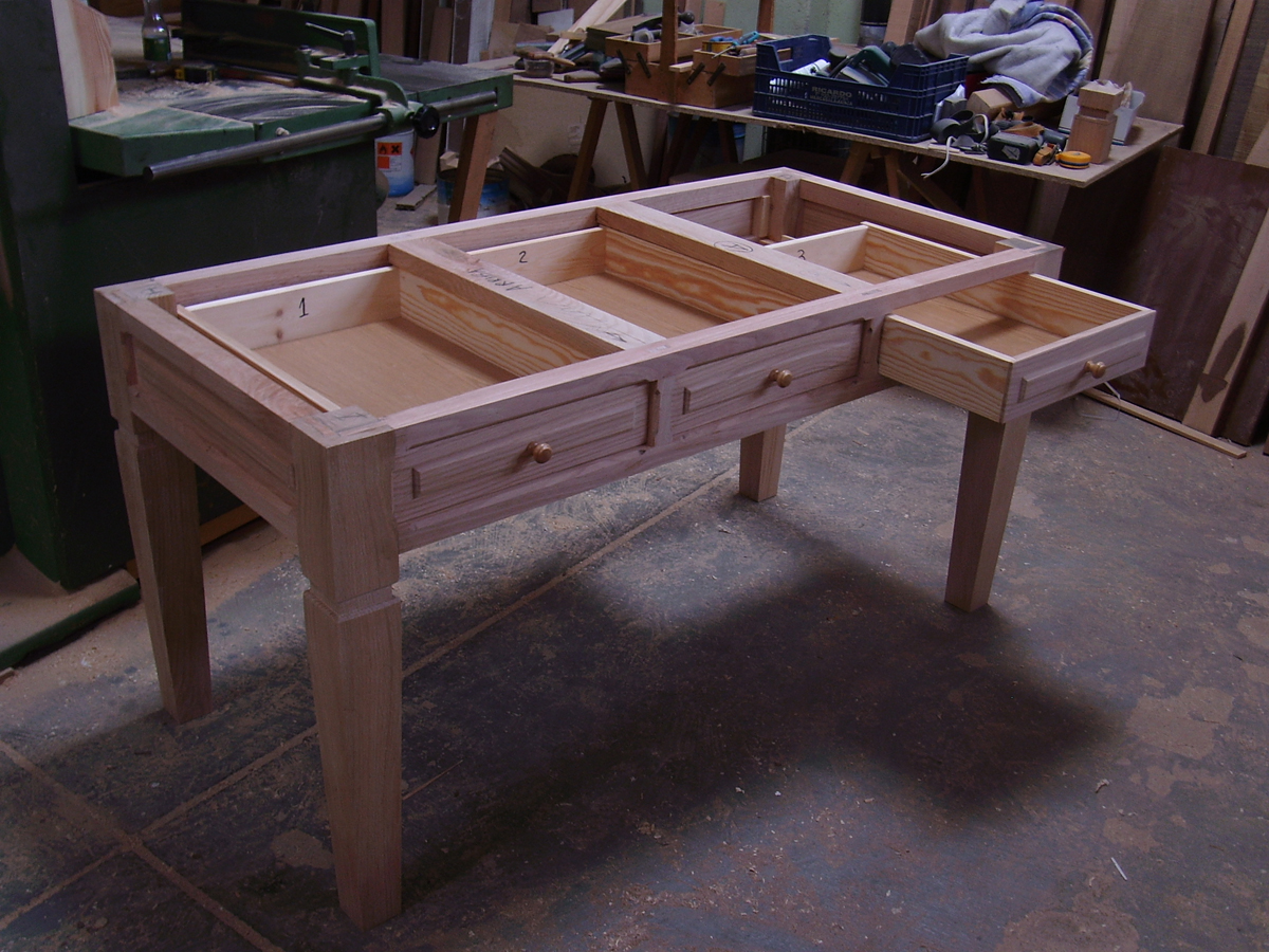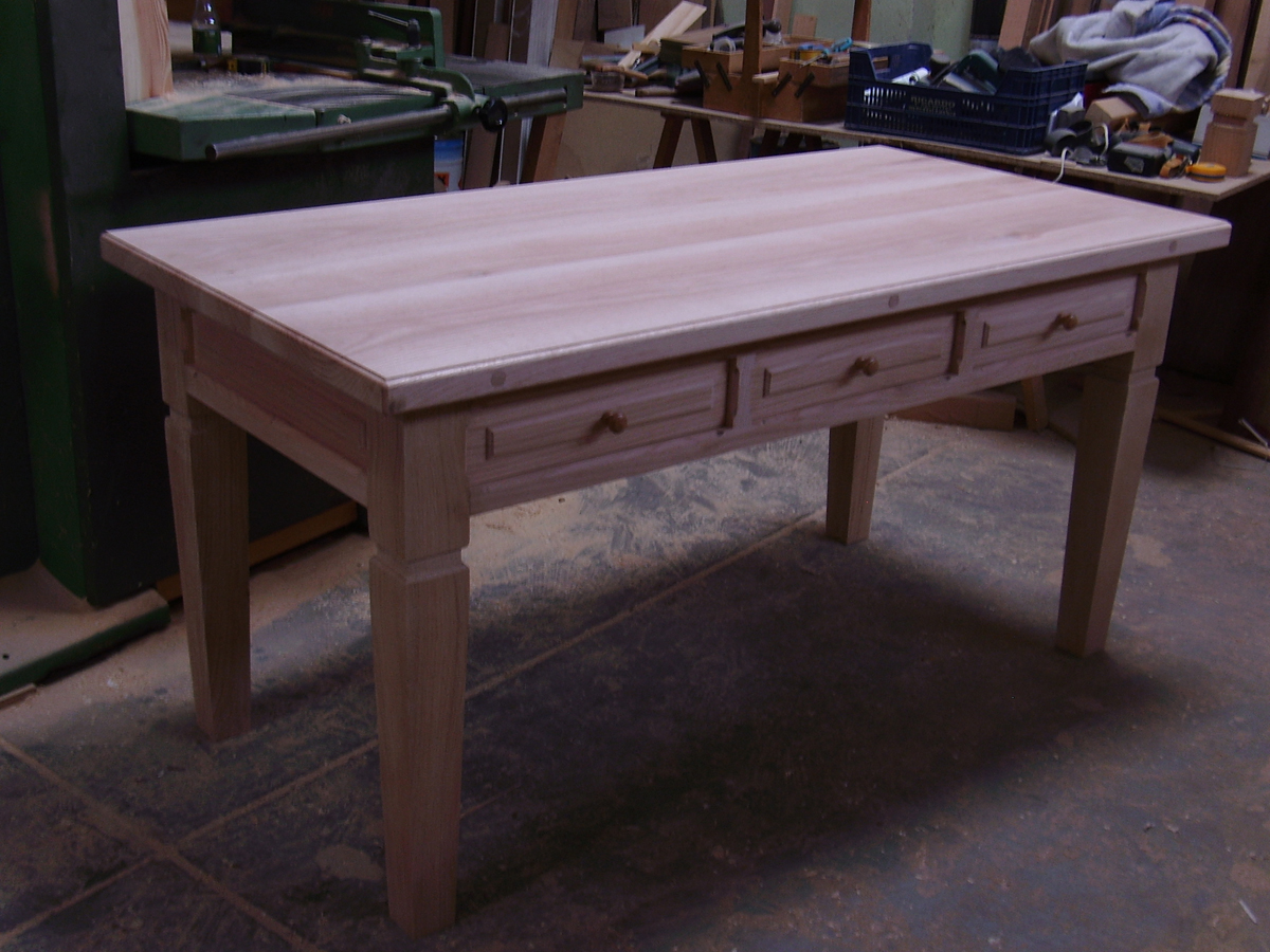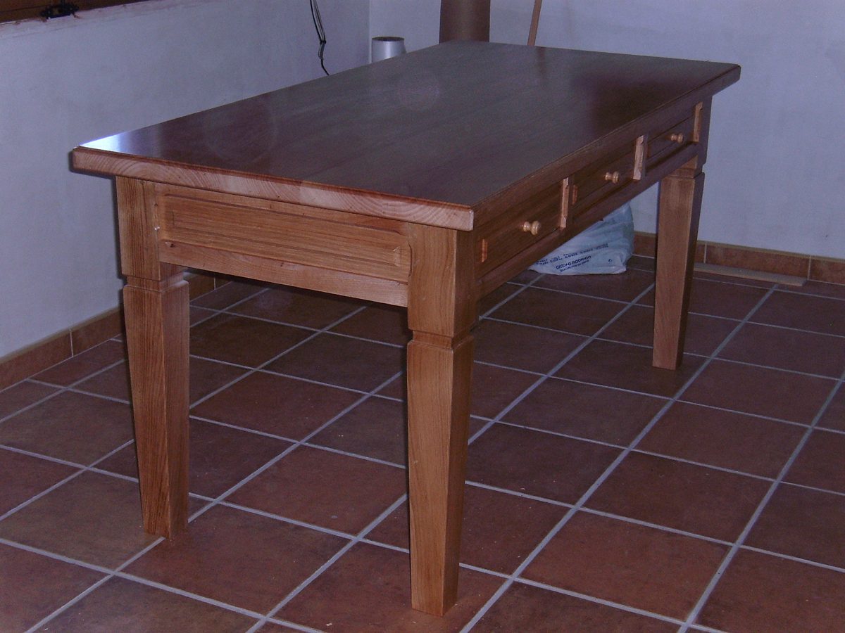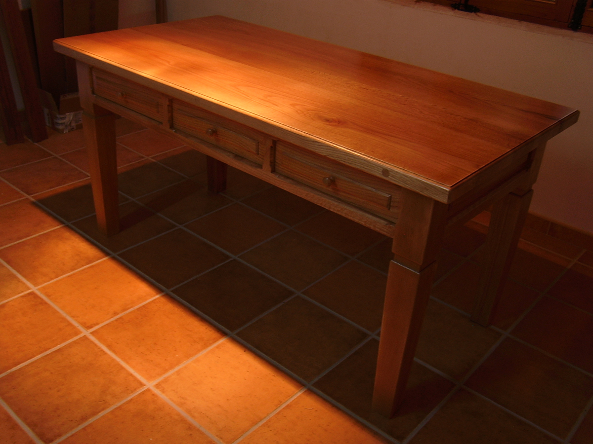Con tres cajones bajo la encimera. Patas cuadradas con relieves.