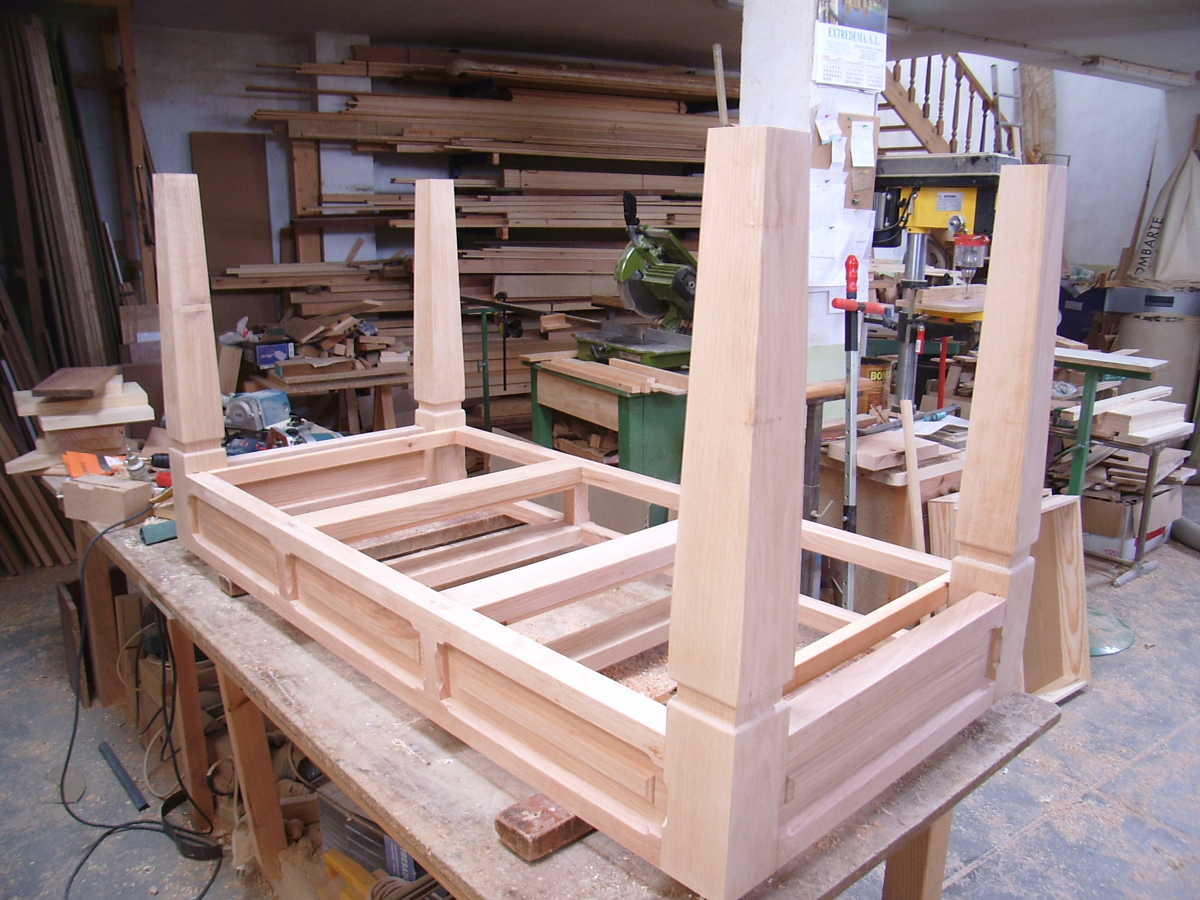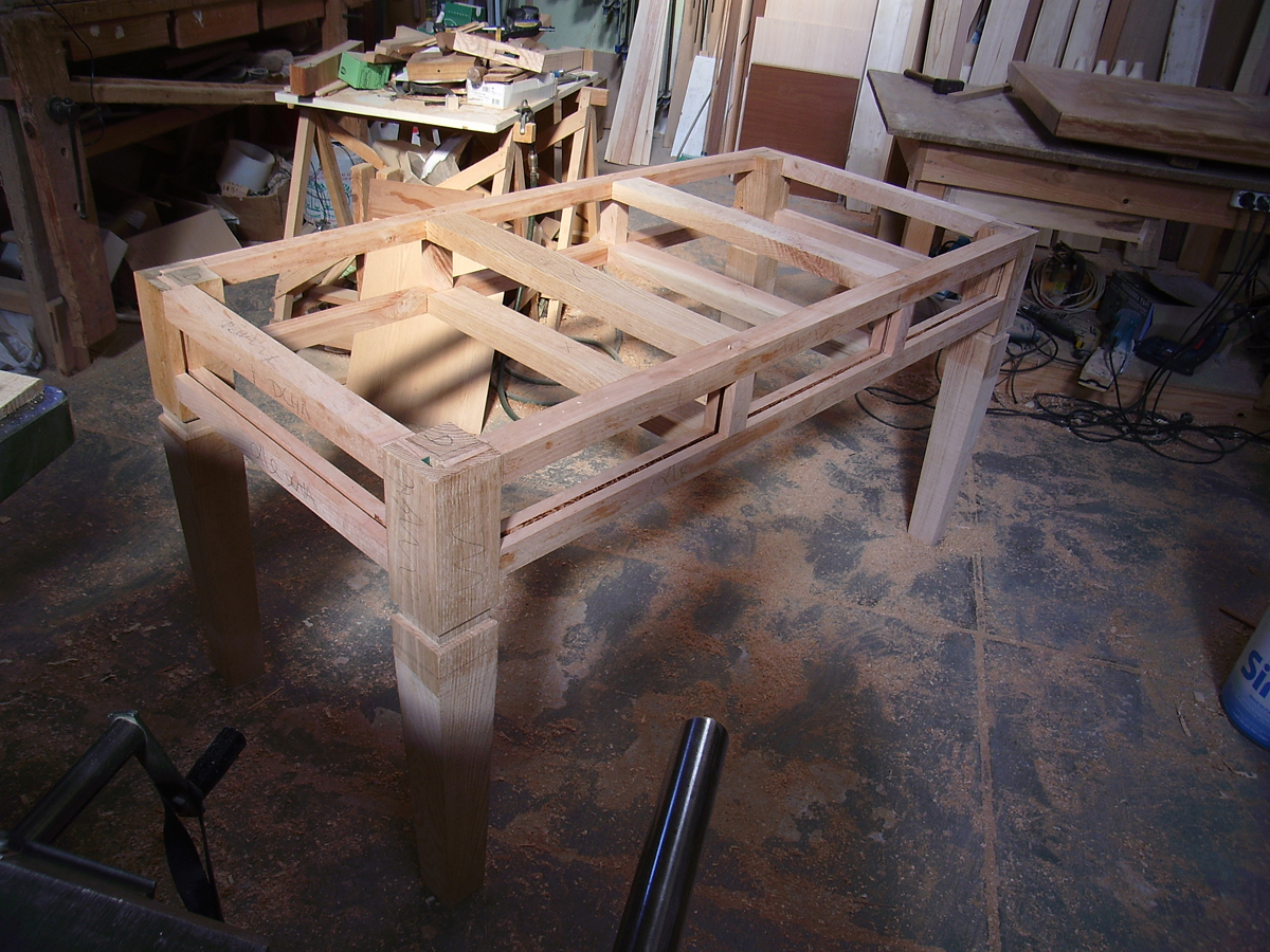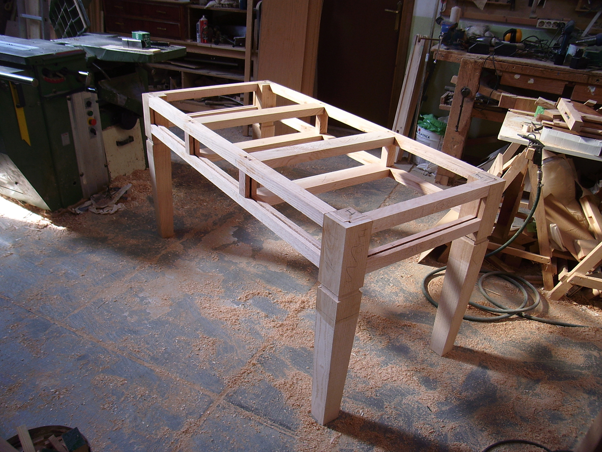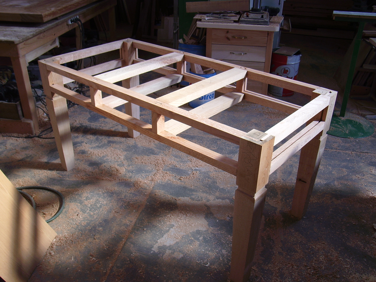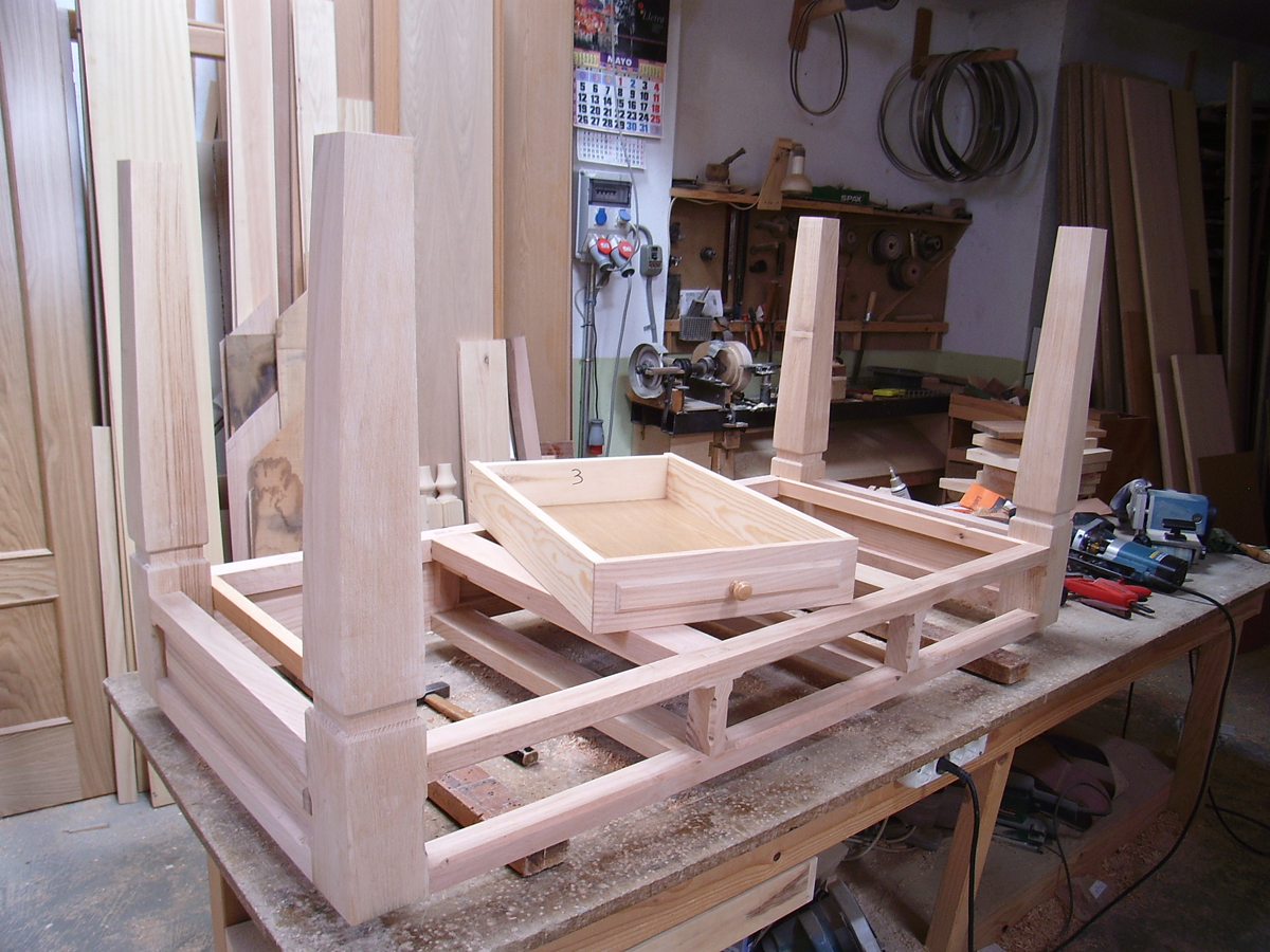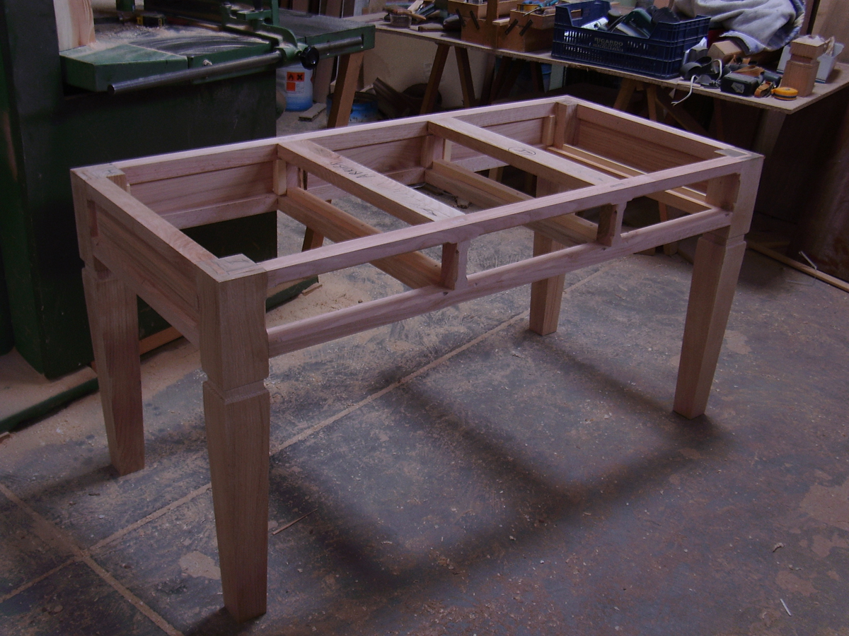 Con tres cajones bajo la encimera. Patas cuadradas con relieves.